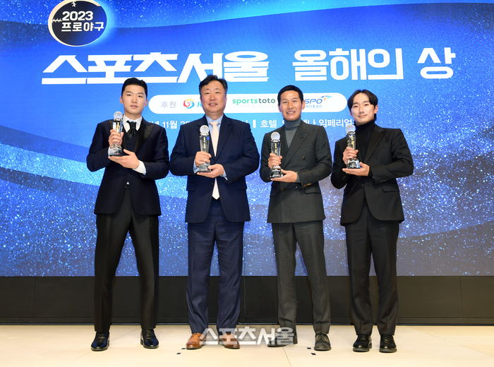 LG는 30일 서울 엘리에나 호텔 임페리얼홀에서 열린 ‘2023 프로야구 스포츠서울 올해의 상’ 시상식에서 5개 부문 트로피를 거머쥐었다. 코치상을 수상한 이호준 타격 코치를 시작으로 수비상의 박해민, 프런트상의 차명석 단장이 단상에 올랐다. 이 코치가 개인 사정으로 불참하면서 차 단장이 이 코치를 대신해 트로피를 받았다. 이후 성취상의 신민재, 감독상의 염경엽 감독이 2023년 통합우승의 기쁨과 소감을 전했다.