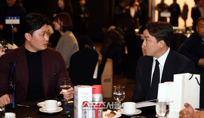젊은 감독들이 모인 다른 테이블은 ‘현대 유니콘스 동문회’로 열렸다. 한화 최원호 삼성 박진만 키움 홍원기 감독에 초보 사령탑으로 시상식장에 처음 참석한 SSG 이숭용 감독이 합류했다. 이들을 본 KIA 심재학 단장은 “현대 동문회”라며 주최측의 센스(?)에 엄지를 치켜들었다.