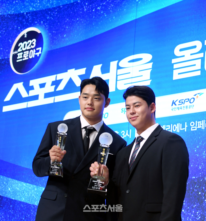 수상자 그룹의 신·구 조화도 돋보였다. 올해의 아마추어로 선정된 김택연(인천고)은 “선배님들과 한자리에 있으니 진짜 프로가 된 것 같다. 신기하고 즐거운 경험”이라며 벌어진 입을 다물지 못했다. ‘신인왕’ 문동주와 팬투표로 선정된 ‘우리들의 슈퍼스타’ 문현빈, ‘올해의 선수’ 영예를 차지한 노시환(이상 한화) 등 젊은 선수들이 한자리에 앉았다.