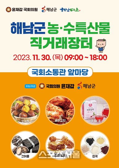 [스포츠서울|조광태 기자] 윤재갑 국회의원(더불어민주당 해남·완도·진도)이 주최하고 해남군이 주관한 ‘해남군 우수 농수산물 국회 직거래장터’가 지난 30일 국회 소통관에서 열렸다.