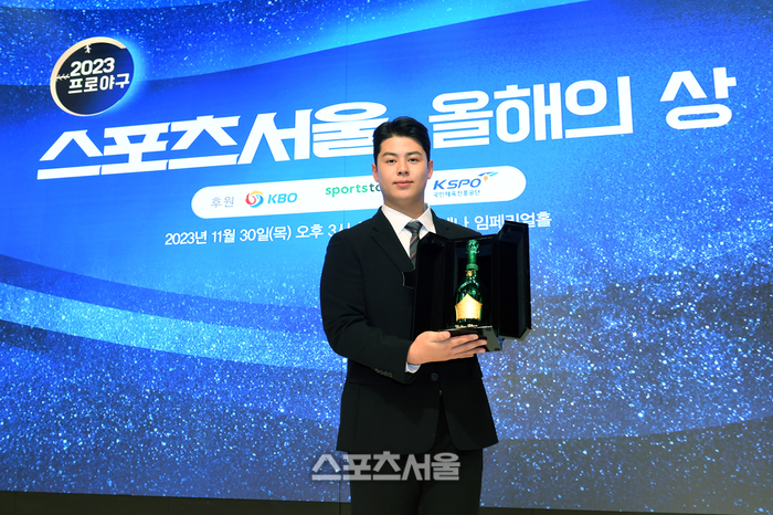 한화 노시환이 30일 서울 강남구 엘리에나 호텔에서 진행된 2023 프로야구 스포츠서울 올해의 상 시상식에서 올해의 선수로 선정된 뒤 부상으로 샴페인 골든블랑을 받아들고 기념촬영을 하고 있다. 노시환이 받은 골든블랑 2013 빈티지 세븐스타는 프레스티지 퀴베급 샴페인으로 페가수스가 새겨진 순금 1돈 펜던트가 걸려있다. 2023. 11. 30. 박진업기자 upandup@sportsseoul.com