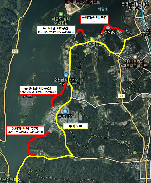 통제 구간은 의암호 순환 코스 4개소 2.62km로 ▲제1구간: 의암공원 야외공연장 입구 ~ KT&G 상상마당춘천 인근(0.45㎞) ▲제2구간: 삼천동 구)중도선착장 앞 ~ 중도물레길 입구(0.37㎞) ▲제3구간: 삼천 낚시터 입구 ~ 송암동 수상협회 입구(0.8㎞) ▲제4구간: 송암스포츠타운 ~ 김유정문인비(1㎞)이다.