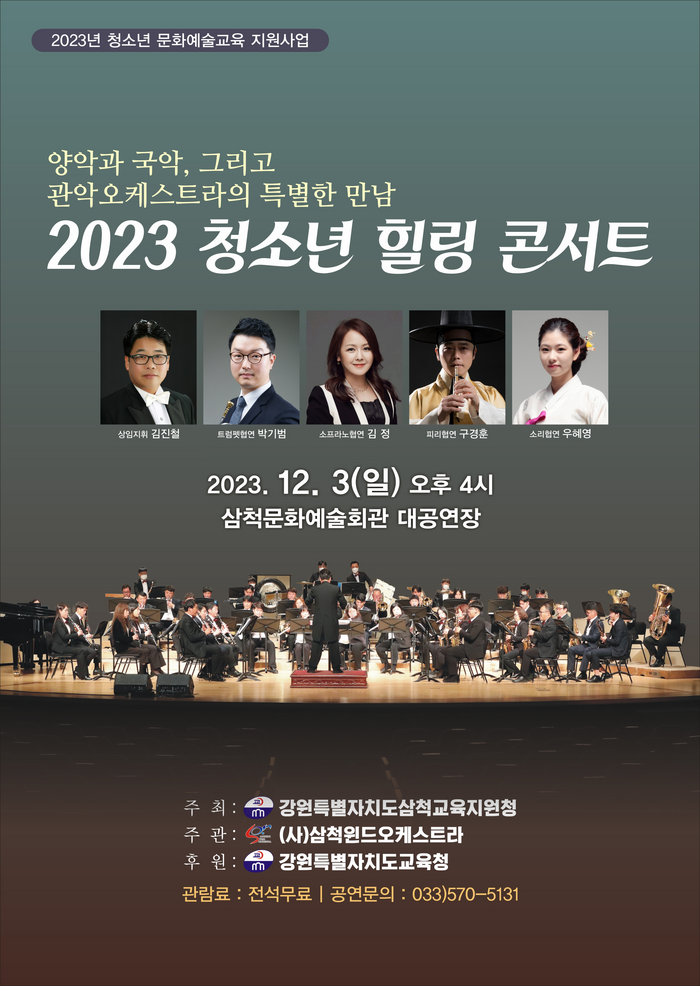 삼척교육지원청이 주최하고 삼척윈드오케스트라(대표 김진철)가 주관하는 이번 청소년 힐링 콘서트는 수능이 끝난 고등학교 3학년 학생 및 관내 청소년, 지역 주민에게 스트레스 해소 및 힐링의 시간을 제공하기 위해 열린다.