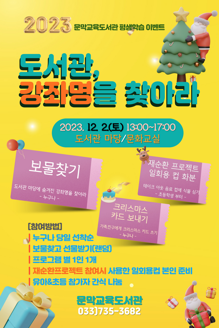 이번 행사에는 △2023년 도서관에서 진행했던 강좌명을 찾아보는 ‘문막교육도서관 보물찾기’ △사용한 일회용 컵에 식물을 심어 다시 가져가는 ‘재순환 프로젝트 커피컵 화분’ 프로그램뿐만 아니라, △12월 사랑하는 가족과 친구에게 크리스마스카드 보내기로 마음을 전하는 시간이 마련되어 있다.
