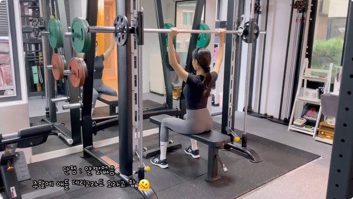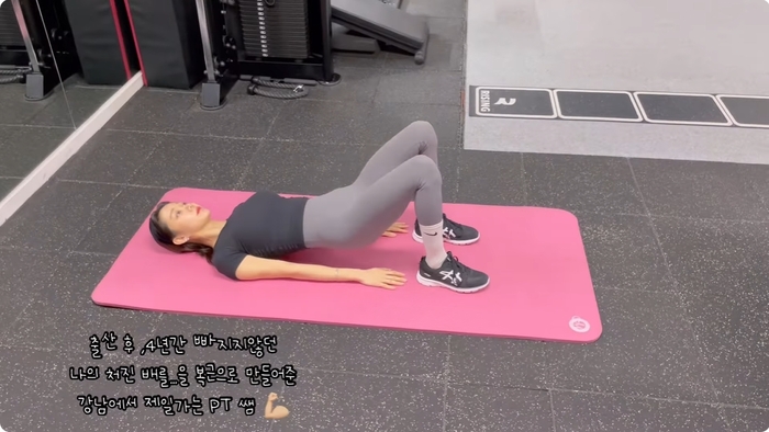 운동을 하는 중간에는 “출산 후 4년간 빠지지 않던 나의 처진 배를 복근으로 만들어 준 강남에서 제일가는 PT 선생님”이라는 자막을 남겼다. 또한 “단점은 얄짤없음. 주말에 애들 데리고라도 오라고 함”이라고 덧붙였다.