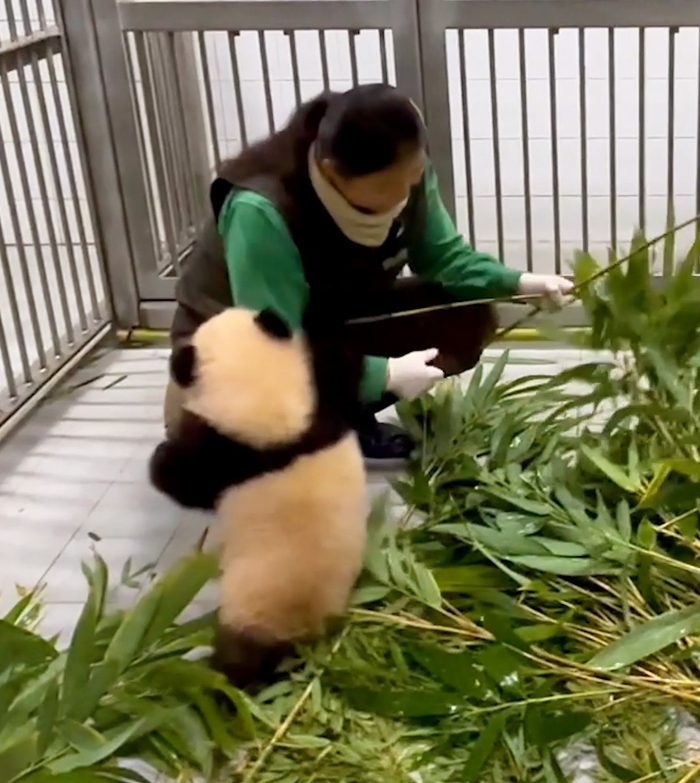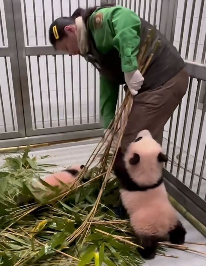 잠시 후 쌍둥이 판다 중 언니인 루이바오까지 놀아달라는 듯한 행동을 보이자 결국 포기한 사육사는 정리하던 대나무를 잠시 내려놓고 아기 판다를 사랑스럽게 어루만지며 함께 놀아준다.