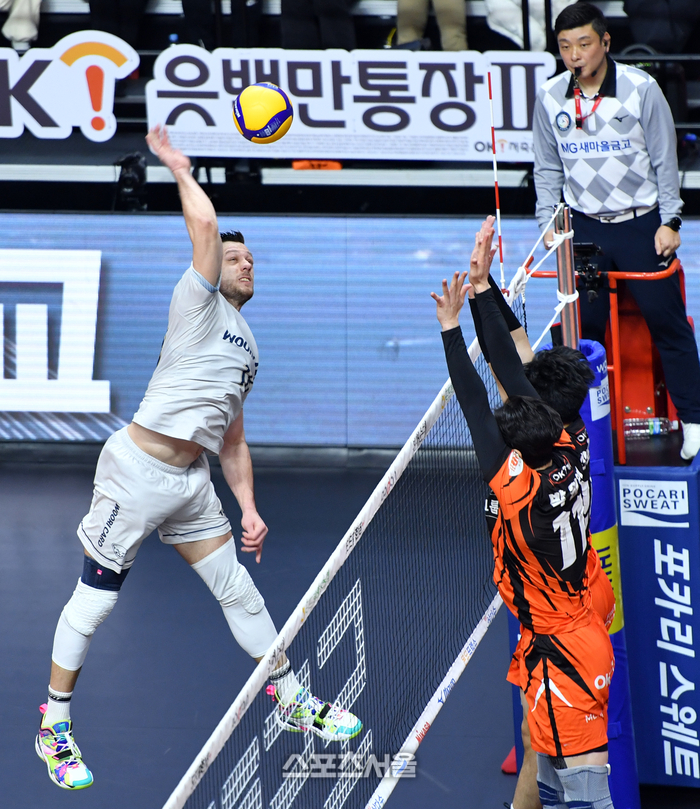 우리 마테이가 3일 안산상록수체육관에서 열린 2023-202 도드람 V리그 OK금융그룹과 우리카드의 경기에서 OK 이중블로킹위로 강타를 시도하고 있다. 2023.12.03. 안산 | 강영조기자 kanjo@sportsseoul.com