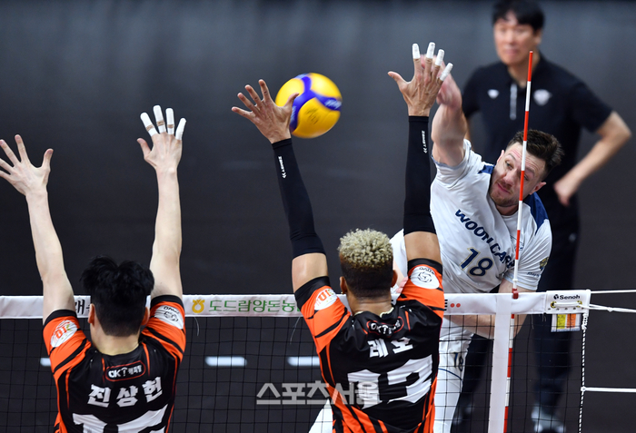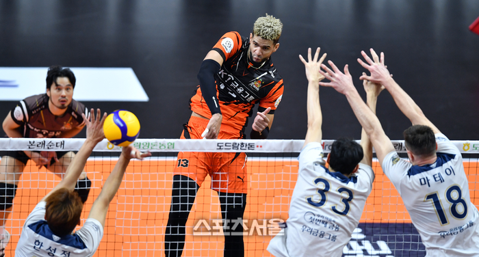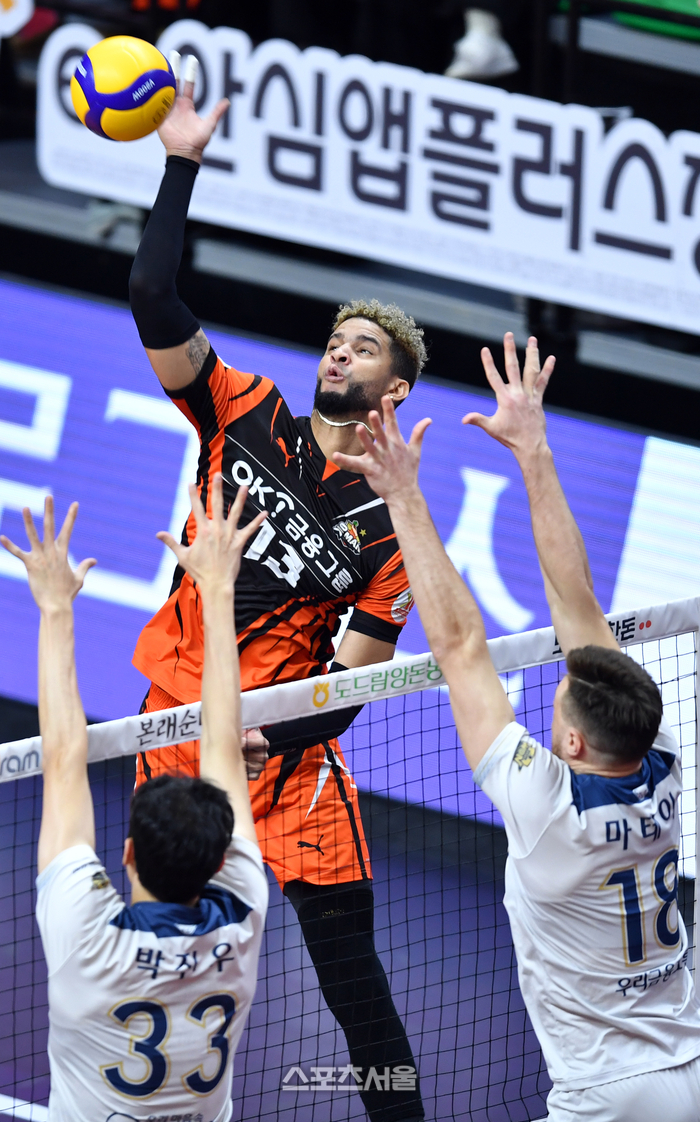 우리카드는 마테이(42득점)를 중심으로 한성정(16득점)과 김지한(14득점)도 득점에 가담했다. OK금융그룹도 레오(38득점)~송희채(23득점)~신호진(14득점)이 고르게 득점을 분배했지만, 뒷심이 부족했다.