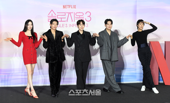 4일 서울 용산구 아이파크몰CGV애서 진행된 넷플릭스 ‘솔로지옥’ 시즌3 제작발표회에서 MC들이 취재진을 향해 포즈를 취하고 있다. 왼쪽부터 배우 이다희, 방송인 덱스, 가수 규현, 가수 한해, 방송인 홍진경. 2023. 12. 4.