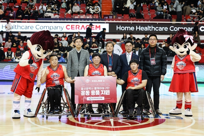 현대모비스는 지난 3일 고양 소노와의 홈경기에서 ‘울산광역시 휠체어 농구팀 훈련용품 전달식’을 진행했다. 이번 훈련용품은 울산현대모비스피버스와 메인용품 후원사 KELME가 함께 연고지역인 울산광역시의 사회공헌활동 취지로 선수 홈·원정 유니폼과 트레이닝 집업, 단체복 등 전달했다.