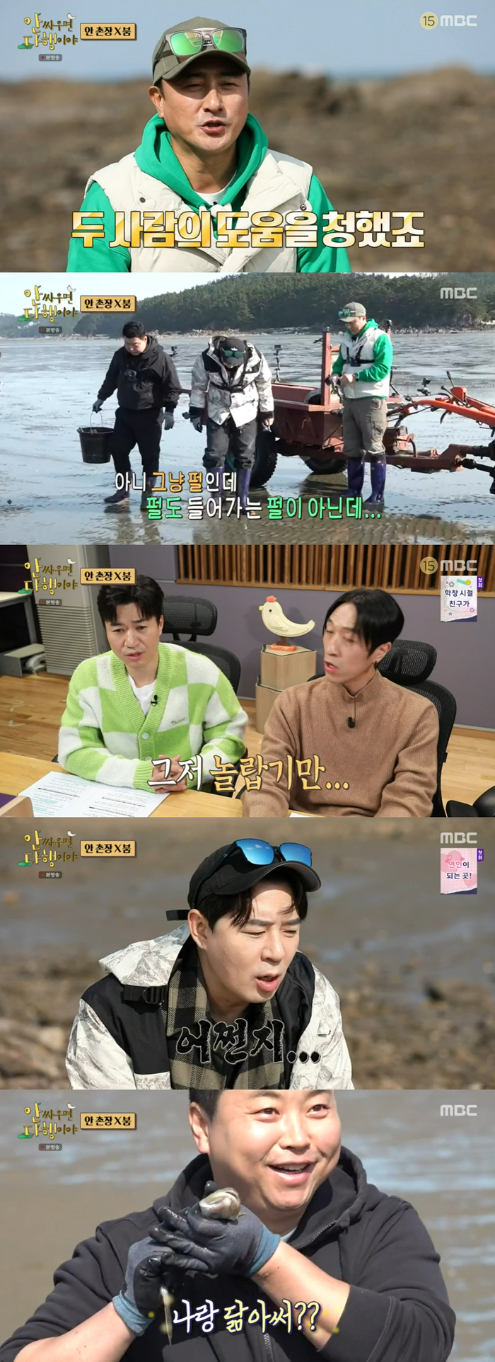 4일 방송된 MBC ‘안 싸우면 다행이야’(이하 ‘안다행’)에서 스튜디오 MC 안정환과 붐이 3년만에 함께 섬으로 떠났다. 경운기를 타고 붐을 직접 픽업한 안촌장은 한참을 달려 “여기가 굴밭이야”라며 갯벌 한가운데 자리한 굴밭으로 인도했다.
