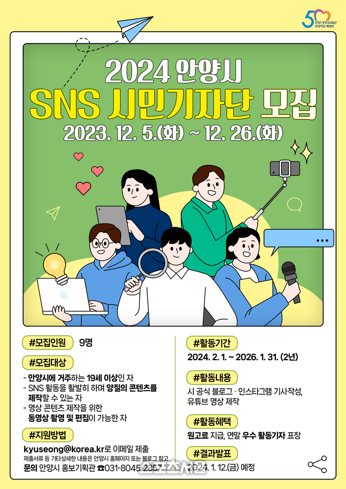 최대호 시장은 “SNS 시민기자단은 취재를 통해 현장의 소식과 모습을 전하며, 시와 시민과의 중요한 소통창구 역할을 해오고 있다.이번 공모에 시민들의 많은 관심과 참여를 바란다”고 말했다.