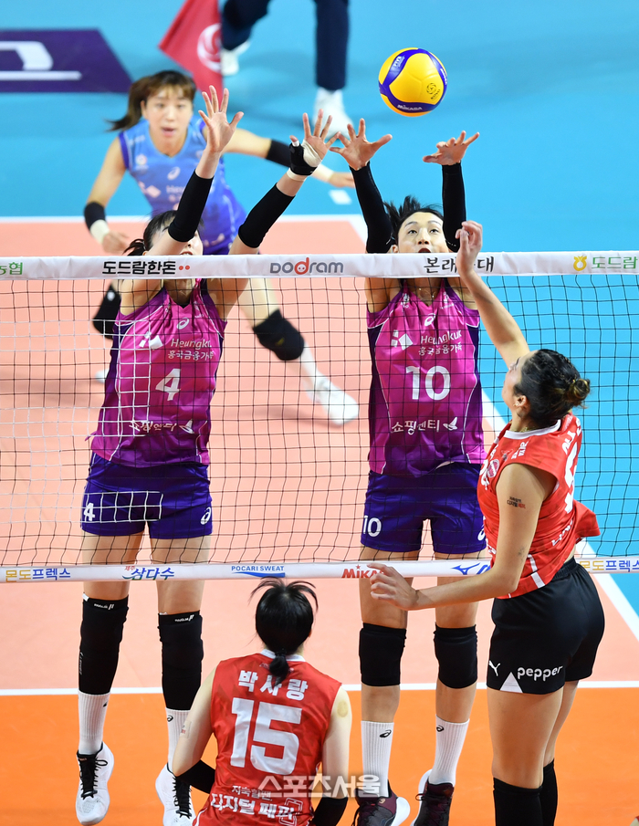 흥국 김연경이 5일 인천 삼산월드체육관에서 열린 2023 도드람 V리그 여자부 흥국생명과 페퍼저축은행의 경기에서 야스민의 연타를 블로킹하고 있다. 2023.12.05. 인천 | 강영조기자 kanjo@sportsseoul.com