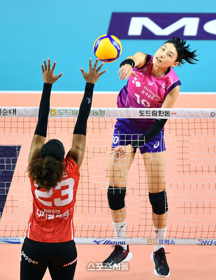 흥국 김연경이 5일 인천 삼산월드체육관에서 열린 2023 도드람 V리그 여자부 흥국생명과 페퍼저축은행의 경기에서 페퍼 필립스 블로킹을 따돌리며 후위공격을 시도하고 있다. 2023.12.05. 인천 | 강영조기자 kanjo@sportsseoul.com