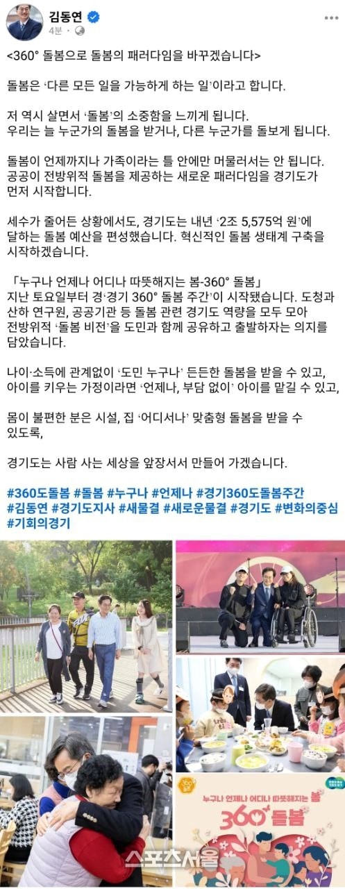 〔스포츠서울│수원=좌승훈기자〕김동연 경기도지사는 5일 자신의 페이스북을 통해 “360° 돌봄으로 돌봄의 패러다임을 바꾸겠다”고 강조했다.