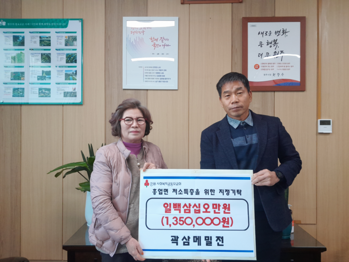 곽 삼 대표는 “메밀전 사업을 운영하는데 우여곡절이 많았으나 지역 주민과 사회 환원을 위해 조금이나마 도움이 되는 일을 하고 싶었다”며 “흥업면에 어려운 이웃을 위해 써달라”고 전했다.