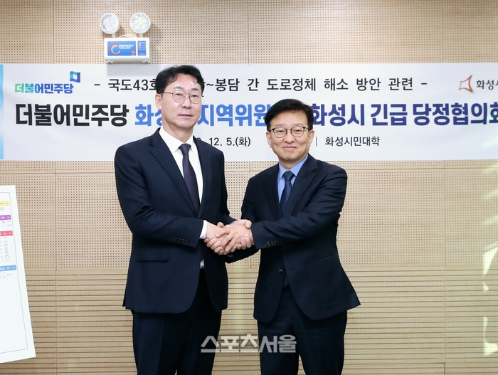 〔스포츠서울│화성=좌승훈기자〕정명근 화성시장과 권칠승 더불어민주당 화성병 지역위원장은 5일 도의원, 시의원, 관계 공무원 등이 참석한 가운데 화성시민대학에서 국도 43호선(봉담~팔탄) 교통체증 해소 방안 등을 모색하는 당정협의회를 가졌다.