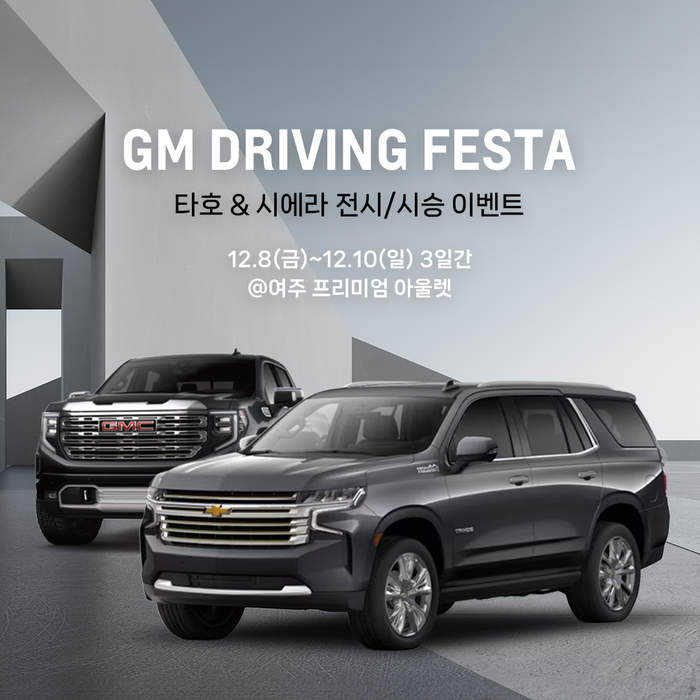 [스포츠서울|배우근기자] 제너럴 모터스(GM)가 ‘지엠 드라이빙 페스타(GM Driving Festa)’를 연다. 정통 아메리칸 감성의 크로스오버, SUV와 픽업트럭을 고객이 직접 보고 체험할 수 있다.