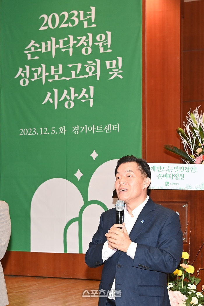 〔스포츠서울│수원=좌승훈기자〕이재준 수원특례시장은 5일 경기아트센터에서 열린 ‘2023년 손바닥정원 성과보고회·시상식’에서 “시민 여러분이 적극적으로 손바닥정원을 조성하고, 아름답게 가꿔나간다면 손바닥정원은 세계가 주목하는 정원문화정책으로 자리매김할 수 있다”고 말했다.