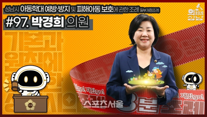 〔스포츠서울│성남=좌승훈기자〕성남시의회는 ‘3분 조례’로 박경희 의원 등 17명이 발의한 ‘아동학대 예방·방지 및 피해 아동 보호에 관한 조례 일부개정조례’를 6일 시의회 공식 SNS에 게시했다.