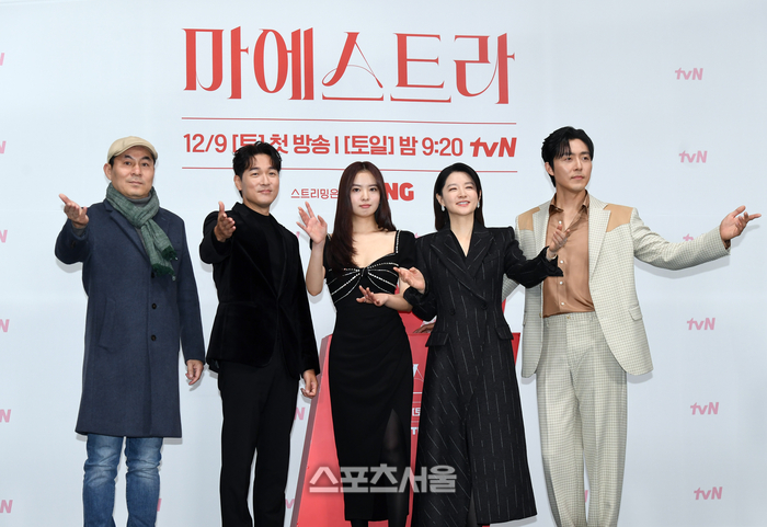 6일 오전 서울 구로구 라마다서울신도림호텔에서 진행된 tvN 토일 드라마 ‘마에스트라’ 제작발표회에서 김정권 감독과 출연 배우들이 취재진을 향해 포즈를 취하고 있다. 왼쪽부터 김정권 감독, 배우 김영재, 황보름별, 이영애, 이무생.