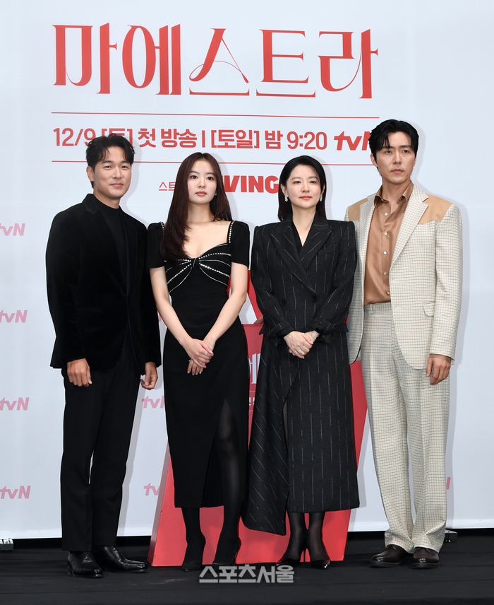 6일 오전 서울 구로구 라마다서울신도림호텔에서 진행된 tvN 토일 드라마 '마에스트라' 제작발표회에서 출연 배우들이 취재진을 향해 포즈를 취하고 있다. 배우 김영재, 황보름별, 이영애, 이무생. '마에스트라'는 전 세계 단 5%뿐인 여성 지휘자 마에스트라 천재 혹은 전설이라 불리는 차세음(이영애 분)이 자신의 비밀을 감춘 채 오케스트라를 둘러싼 사건의 진실을 찾아가는 미스터리 드라마로 이영애, 이무생, 김영재, 황보름별 등이 출연하며 김정권 감독이 연출을 맡았다. 2023. 12. 6. 박진업기자 upandup@sportsseoul.com