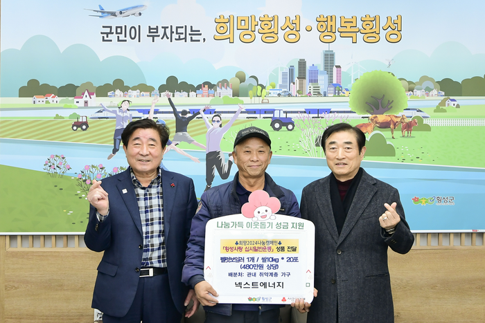 [스포츠서울ㅣ김기원기자] 넥스트에너지(대표 김효겸)는 ‘횡성사랑 십시일반운동’에 동참하는 의미에서 12월 6일 횡성군청을 방문하여 480만 원 상당의 펠릿보일러와 쌀 10kg 20포를 기부했다.