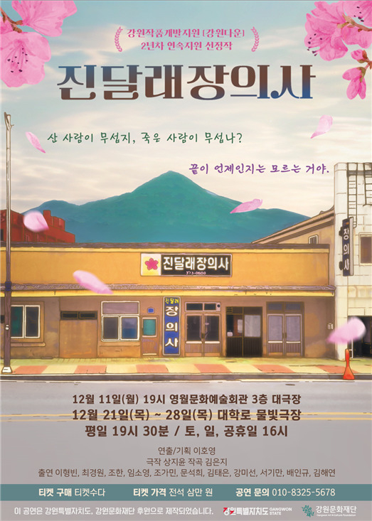 [스포츠서울ㅣ춘천=김기원기자] 강원문화재단(대표이사 신현상)의「2023 강원작품개발지원사업」의 일환으로 제작된 이호영 연출가의 연극 ‘진달래장의사’가 오는 12월 11일 영월문화예술회관, 12월 21일~28일까지 서울 대학로 물빛극장에서 관객을 맞이한다.