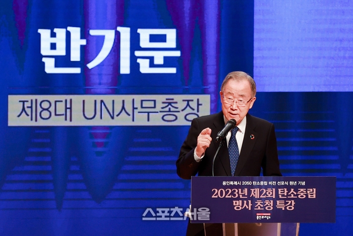〔스포츠서울│용인=좌승훈기자〕반기문 전 유엔 사무총장은 5일 경기 용인시 에이스 홀에서 열린 제2회 탄소중립 명사 초청 특강을 통해 “세상에 자연을 이길 수 있는 것은 없다. 지금까지 인류가 이룬 모든 것이 기후변화로 인해 순식간에 사라질 수도 있다. 인류의 지속 가능한 발전을 위해서는 가장 먼저 기후 위기부터 극복해야 한다”고 강조했다.