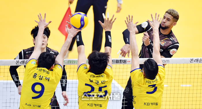 OK 레오가 6일 의정부체육관에서 열린 2023 도드람 V리그 남자부 KB손해보험과 OK금융그룹과의 경기에서 KB 삼중블로킹을 따돌리며 공격을 성공하고 있다. 2023.12.06.