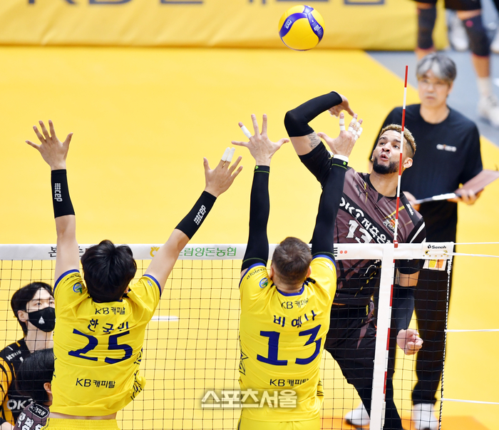 OK 레오가 6일 의정부체육관에서 열린 2023 도드람 V리그 남자부 KB손해보험과 OK금융그룹과의 경기에서 KB 이중블로킹을 따돌리며 공격을 성공하고 있다. 2023.12.06.