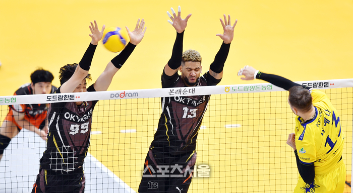 KB 비예나가 6일 의정부체육관에서 열린 2023 도드람 V리그 남자부 KB손해보험과 OK금융그룹과의 경기에서 OK 이중블로킹을 따돌리며 공격을 성공하고 있다. 2023.12.06. 의정부 | 강영조기자 kanjo@sportsseoul.com
