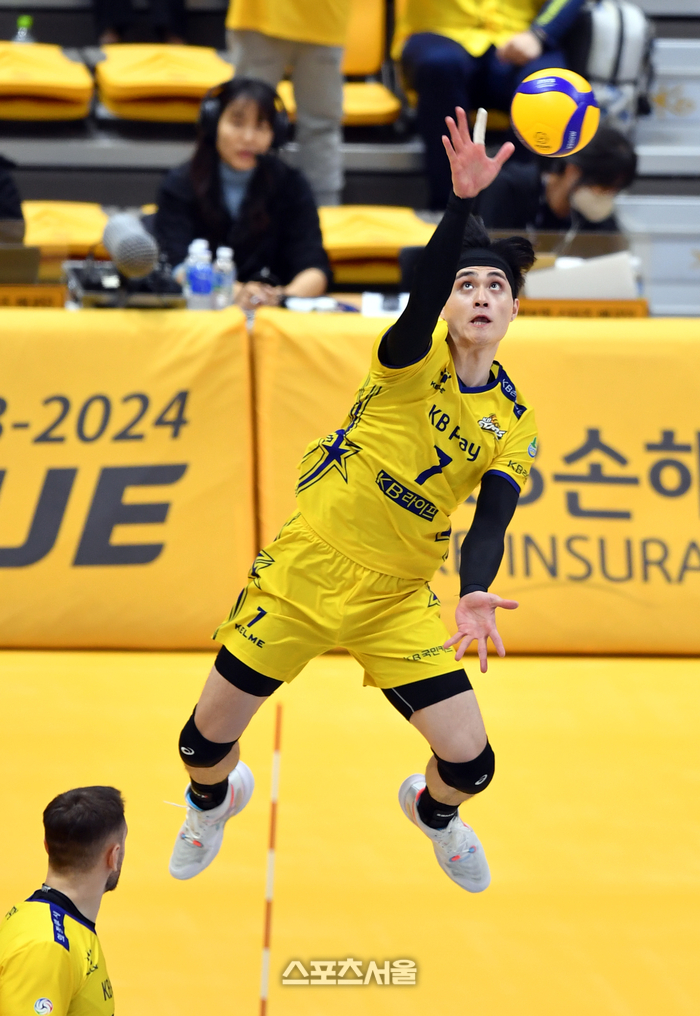 KB 리우홍민이 6일 의정부체육관에서 열린 2023 도드람 V리그 남자부 KB손해보험과 OK금융그룹과의 경기에서 특이한 자세로 서브를 하고 있다. 2023.12.06. 의정부 | 강영조기자 kanjo@sportsseoul.com