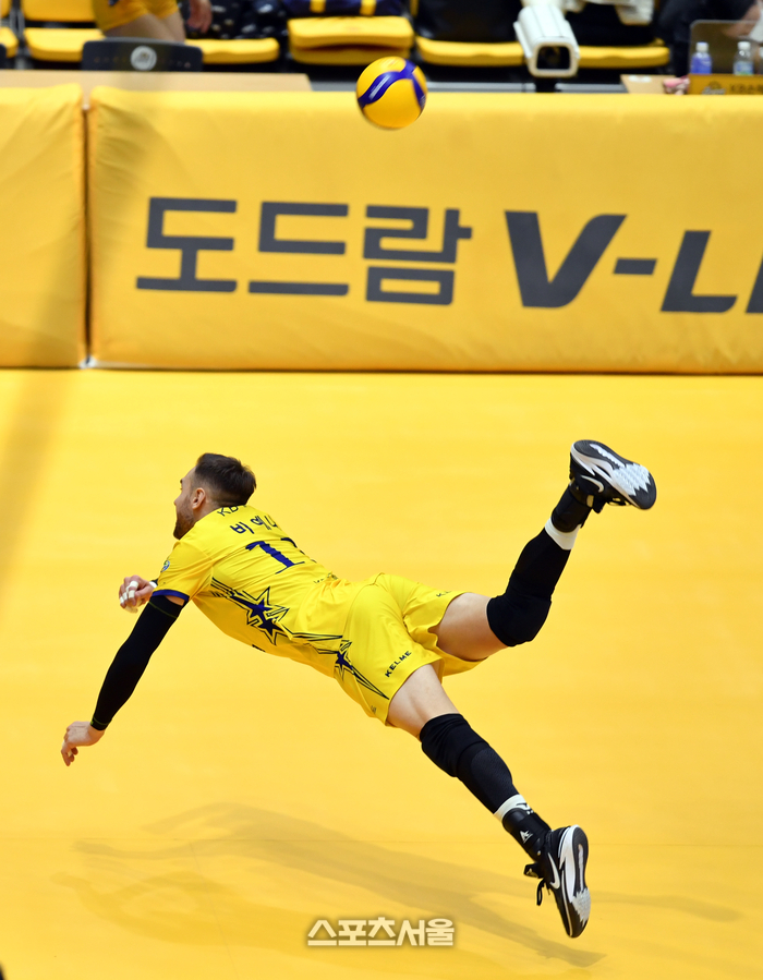KB 비예나가 6일 의정부체육관에서 열린 2023 도드람 V리그 남자부 KB손해보험과 OK금융그룹과의 경기에서 터치아웃되는 볼을 살려내고 있다. 2023.12.06. 의정부 | 강영조기자 kanjo@sportsseoul.com