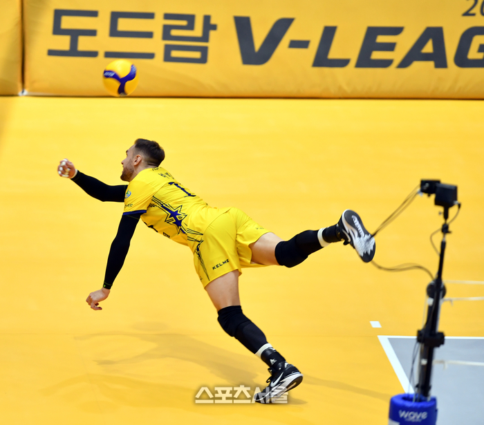 KB 비예나가 6일 의정부체육관에서 열린 2023 도드람 V리그 남자부 KB손해보험과 OK금융그룹과의 경기에서 터치아웃되는 볼을 살려내고 있다. 2023.12.06. 의정부 | 강영조기자 kanjo@sportsseoul.com