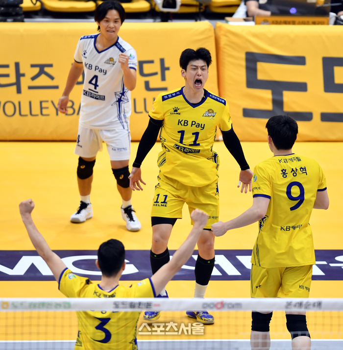 KB 김홍정이 6일 의정부체육관에서 열린 2023 도드람 V리그 남자부 KB손해보험과 OK금융그룹과의 경기에서 득점한 후 환호하고 있다. 2023.12.06. 의정부 | 강영조기자 kanjo@sportsseoul.com