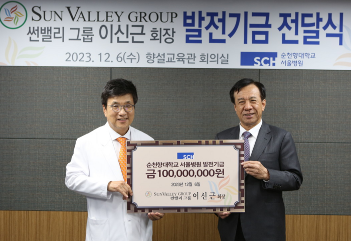 썬밸리 이신근 회장은 “순천향대학병원은 지역 사회에서 중요한의료 기관으로서 뛰어난 의료 서비스를 제공하고 있다. 나의 작은 도움이 순천향대학 병원이 더 나은 환자 치료 및 지원을 할 수 있도록 돕기를 바란다”고 밝혔다.