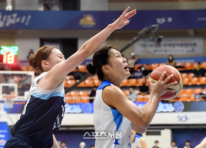 우리은행 박지현(오른쪽)이 8일 인천 도원체육관에서 열린 2023-2024 여자프로농구 신한은행과 경기에서 신한은행 김진영의 수비를 피해 레이업슛을 하고 있다. 2023. 12. 8. 인천 | 박진업기자 upandup@sportsseoul.com