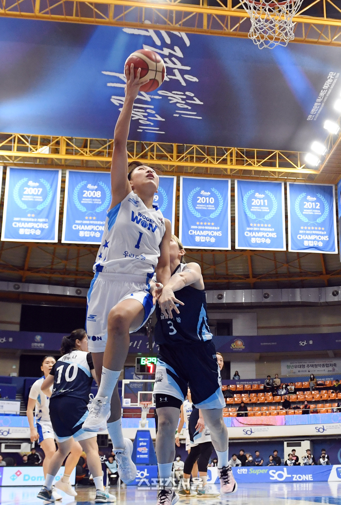 우리은행 박지현(왼쪽)이 8일 인천 도원체육관에서 열린 2023-2024 여자프로농구 신한은행과 경기에서 신한은행 이혜미의 수비를 피해 레이업슛을 하고 있다. 2023. 12. 8. 인천 | 박진업기자 upandup@sportsseoul.com