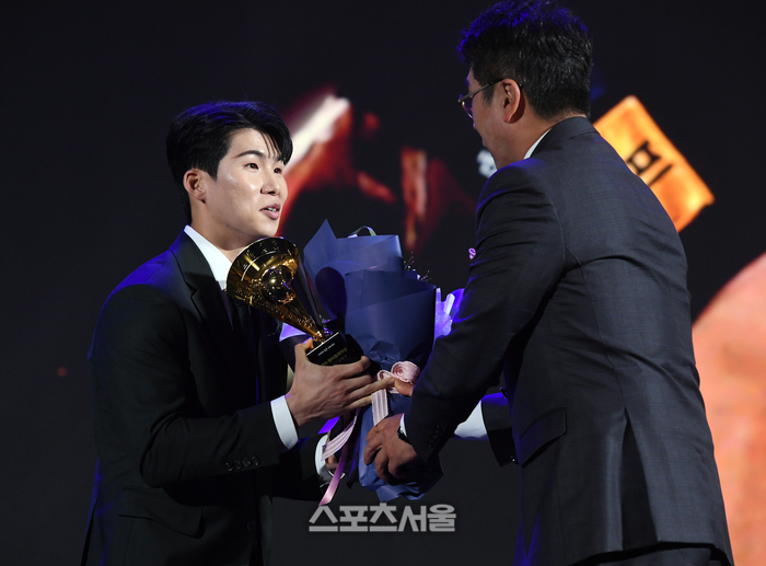 키움 히어로즈 김혜성(왼쪽)이 1일 서울 강남구 코엑스 오리토리움에서 진행된 2023 KBO 골든글러브 시상식에서 페어플레이상을 수상한 뒤 홍원기 감독의 축하를 받고 있다. 2023. 12. 11. 박진업기자 upandup@sportsseoul.com