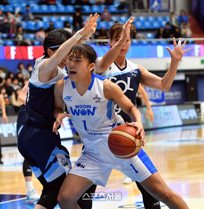 우리 박지현이 11일 인천 도원체육관에서 열린 2023-2024 WKBL 신한은행과 우리은행의 경기에서 강계리의 마크를 받으며 돌파를 시도하고 있다. 2023.12.11.
