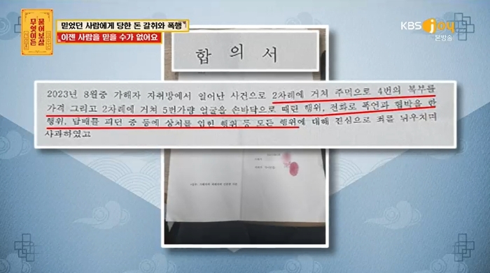 결국 사연자는 경찰에 신고해 천만 원을 받고 합의를 했다고 밝혔다. 정작 사연자에게는 사과 한마디도 없었다고.