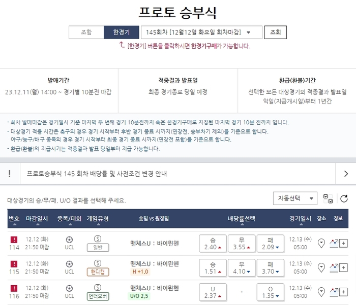 맨체스터 유나이티드(이하 맨유)와 바이에른 뮌헨(이하 뮌헨)의 경기를 대상으로 하는 프로토 승부식 145회차 게임은 ▲114번(일반) ▲115번(핸디캡) ▲116번(언더오버)의 세 가지 방식으로 게임 참여가 가능하며, 12일(화) 오후 9시 50분까지만 구매가 가능하다.