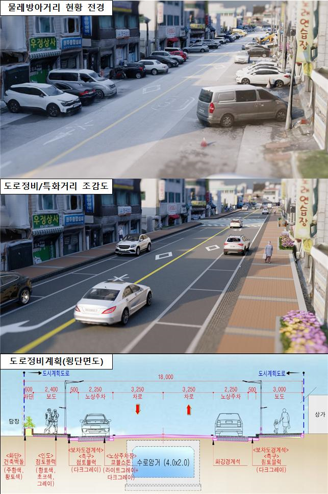 이번에 조성되는 특화거리는 콘크리트 블록과 아스팔트 포장 등 딱딱하고 차가운 이미지의 기존 도로와는 달리 신설 보도(3m)와 화단, 경계석, 측구, 노상주차장까지 콘크리트가 아닌 점토 벽돌 등 벽돌형 자재로 설치 조성하여 부드럽고 친근하면서 따스한 이미지를 가진 우수한 디자인이 반영되도록 노력하였다.