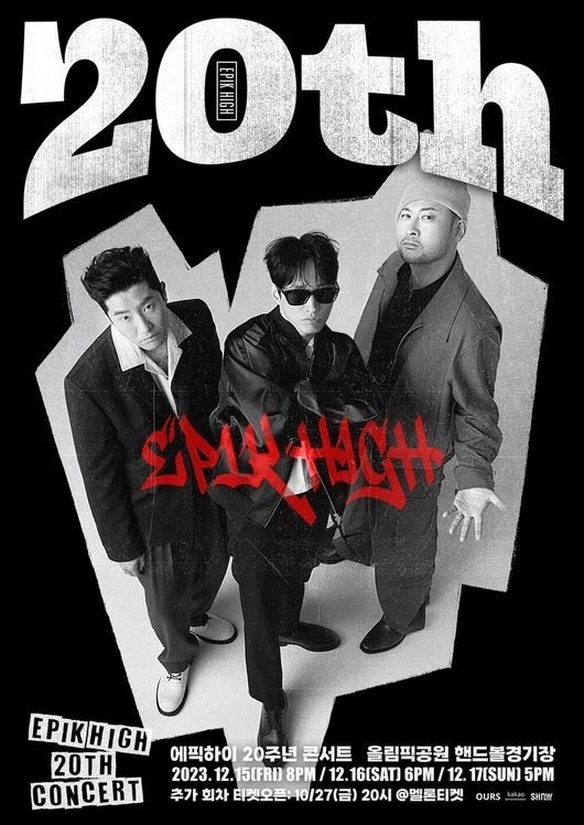 2003년 데뷔한 20살 동갑내기 레전드 스타들의 공연도 눈길을 끈다. 힙합 그룹 에픽하이는 15일부터 17일까지 서울 올림픽공원 핸드볼경기장에서 ‘에픽하이 20주년 콘서트’를 개최한다. 이미 첫 티켓 오픈에서 전석이 매진돼 추가 공연을 결정했다.