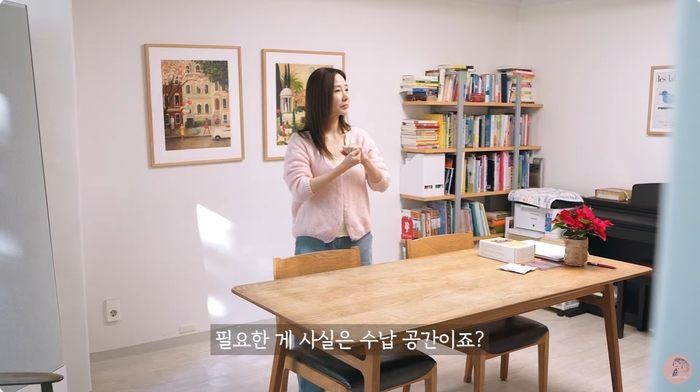 책장에 놓인 책들을 보며 “약간 얇은 것들은 위로 놓으면 빼기가 어려운데, 저런 책은 어른들이 보거나 할 때는 조금 흐트러져도 된다. 가끔 몇 달에 한 번. 저는 6개월에 한 번 정리하나?”라며 웃었다.