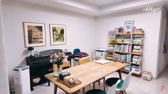 강수지는 피아노 위치를 옮긴 뒤 허전해 보이지 않도록 소품들을 몇 개 올렸다. 책장 등 가구 위치를 바꾸고, 책상 위에는 꽃으로 포인트를 줬다.