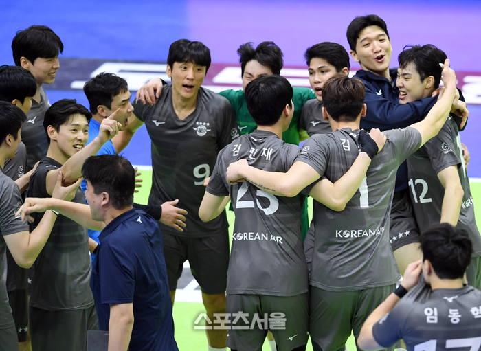 대한항공 선수들이 13일 수원체육관에서 열린 2023-2024 V리그 한국전력과 경기에서 한국전력에 세트 스코어 3-1로 승리한 뒤 함께 기뻐하고 있다. 대한항공은 3연패에서 탈출했다. 2023. 12. 13. 수원 | 박진업기자 upandup@sportsseoul.com