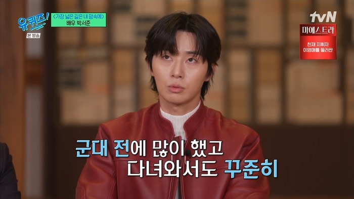 군 생활은 청주 교도소에서 했었다며 “저는 그냥 논산 훈련소 들어갔는데 거기서 차출됐다”라고 설명했다. 박서준은 “이병이나 일병 때는 교도소 내에서 근무하고, 계급이 올라갈수록 재판을 다니거나 검사 조사에 동행한다. 다른 교도소로 이감할 때도”라고 설명했다.