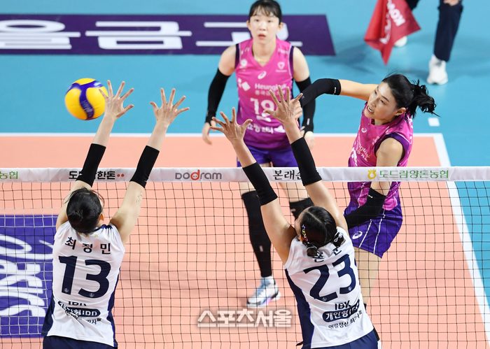 흥국생명 김연경(오른쪽)이 14일 인천 삼산월드체육관에서 열린 2023-2024 V리그 IBK기업은행과 경기에서 스파이크 공격을 하고 있다. 2023. 12. 14. 인천 | 박진업기자 upandup@sportsseou.com